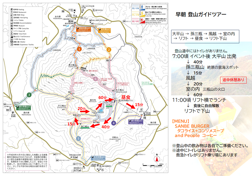 A. 大丈夫です!今回はリフトを使って一番ハードな登りをショートカットします。さらに当日は、三瓶山を知り尽くしたスタッフが一緒に登り、ゆっくりしたペースでご案内しますので、初めての方や体力に自信がない方もどうぞ安心してご参加くださいね。
